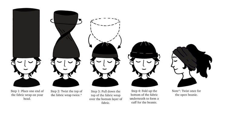 • Beanie: Twist twice in the middle and fold over to create a double-layered, snug beanie for extra warmth and comfort. For an open beanie (great for airflow or a ponytail), use one twist instead.